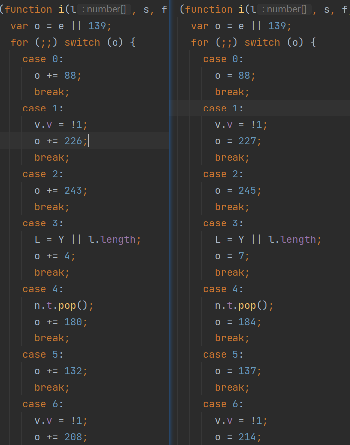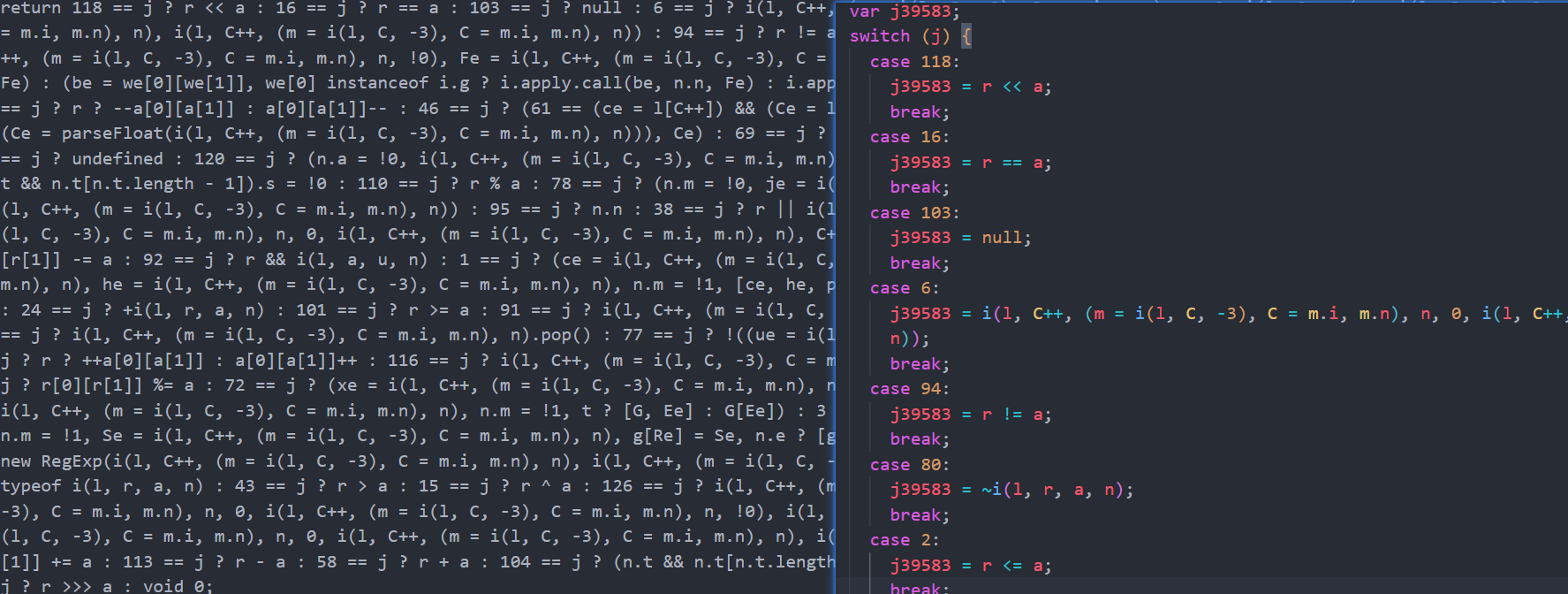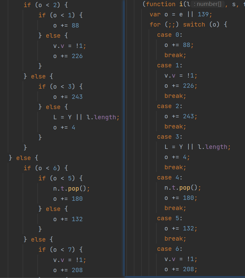 const MergeCases = { SwitchStatement(path) { const { discriminant, cases } = path.node; const name = discriminant.name; let binding = path.scope.getBinding(name); let start = binding.path.node.init.right.value; let map = {}; for (let i = 0; i < cases.length; i++) { getCaseJump(map, name, cases[i]); } path.replaceInline(controlFlowStructure(start, map, cases)); }, };